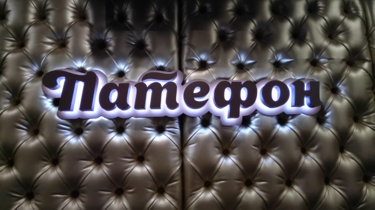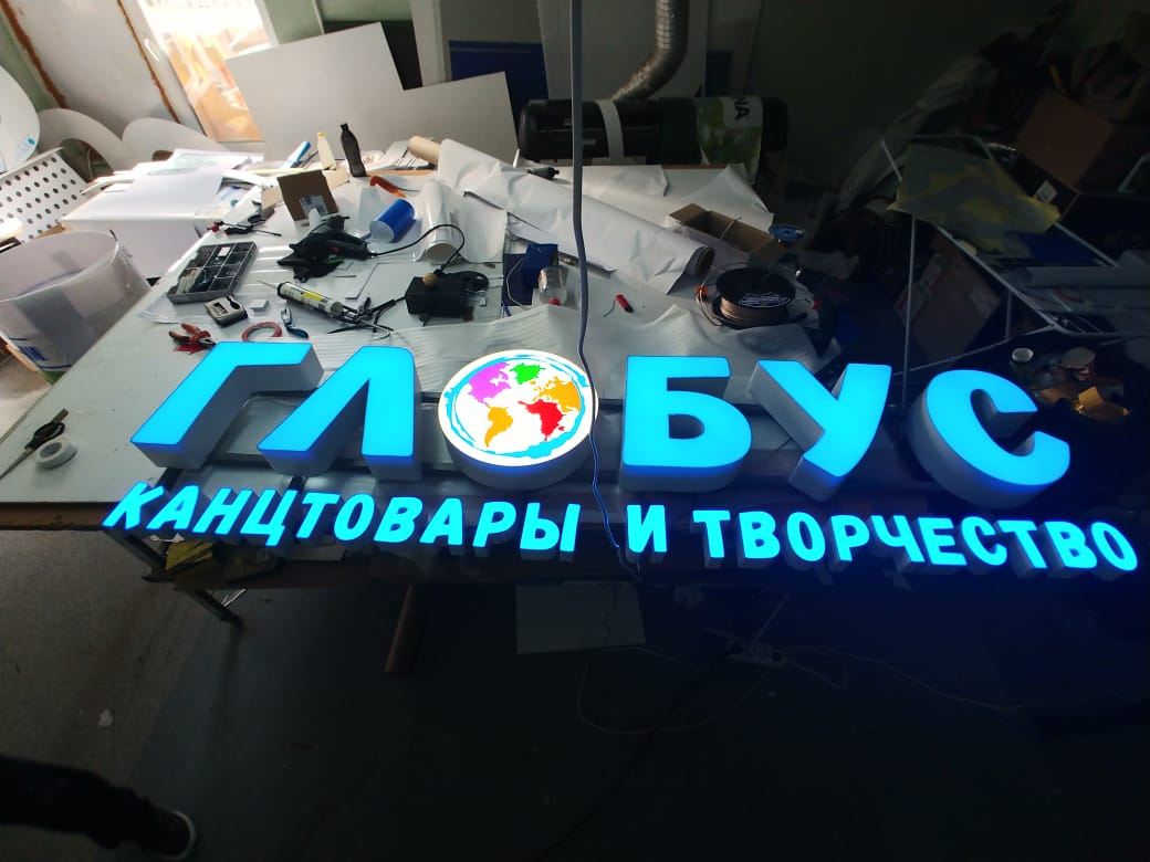Подложка из АКП на каркасе, обтянута пленкой Oracal. Буквы из алюминия и акрилового стекла. Светодиодные кластеры и блок питания в комплекте