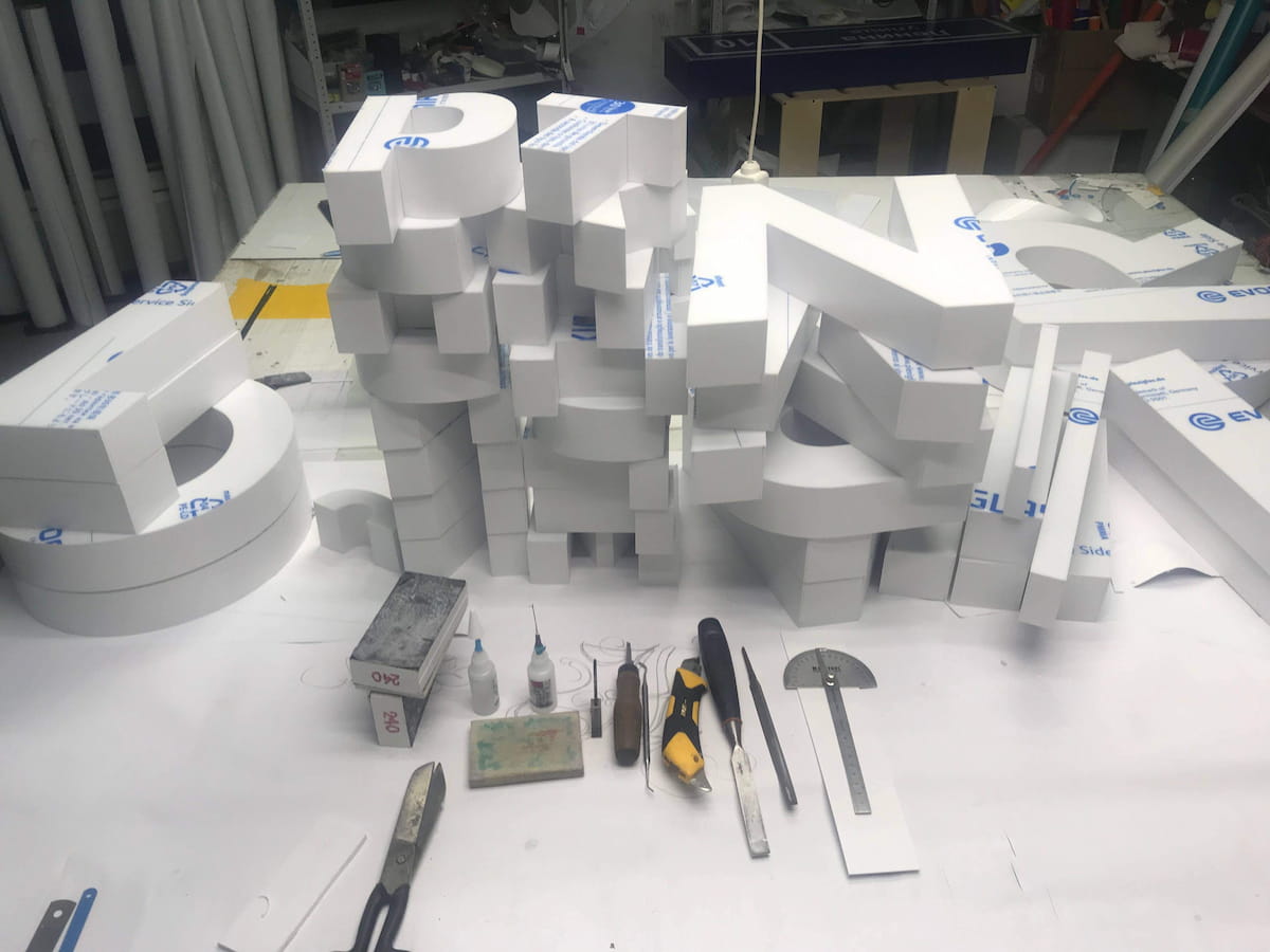 Световые объемные буквы из алюминия и акрилового стекла. Светодиодные кластеры и блок питания в комплекте. Подложка - труба 20х20мм, загрунтована, окрашена